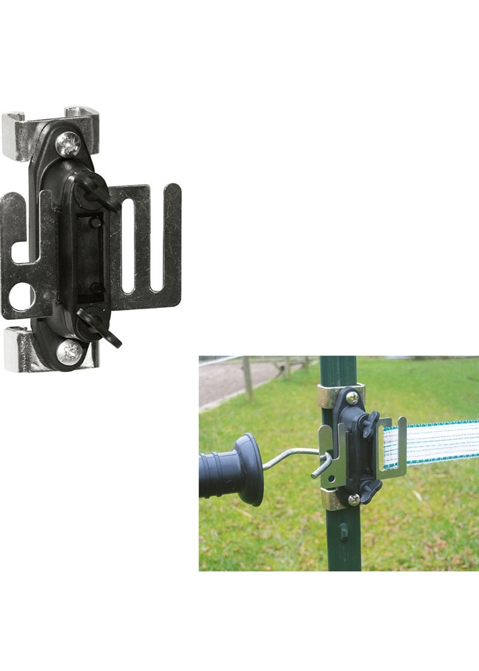 • Robuuste lintisolator met aansluitplaat van RVS voor poortgreep en aansluiting op het schrikdraadapparaat (levering zonder poortgreep).